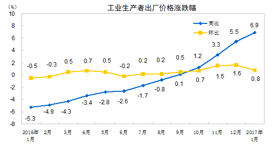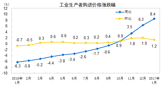 中新网2月14日电 据国家统计局网站消息,2017年1月份,全国工业生产者出厂价格同比上涨6.9%,环比上涨0.8%。工业生产者购进价格同比上涨8.4%,环比上涨1.2%。