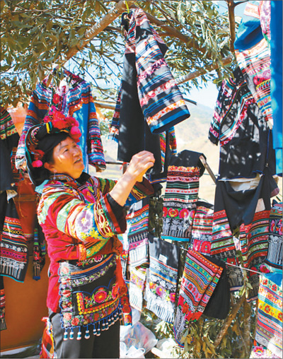 李如秀在赛装节活动现场展示自己多年收藏的彝绣。李发兴摄