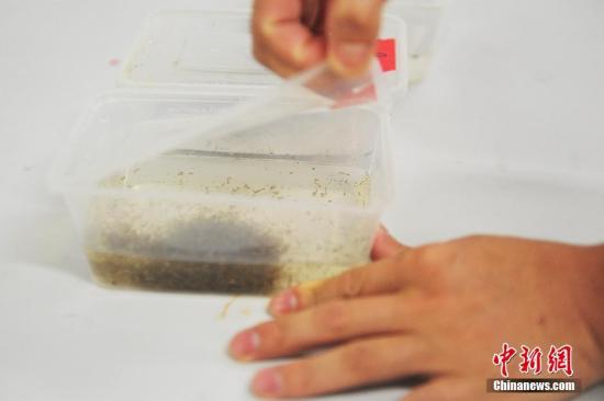 资料图片,实验室科技人员检查蚊子幼虫的托盘。 中新社记者 黄卓贤 摄