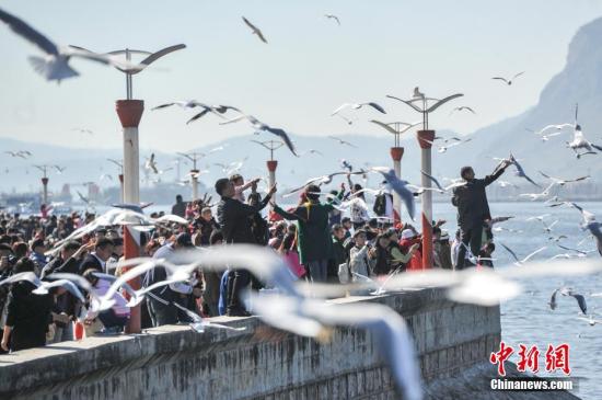 2月4日,春节长假刚刚结束,仍然有大批游客聚集到昆明滇池边,观鸥喂鸥,与红嘴鸥一起共享昆明暖阳和蓝天。中新社记者 任东 摄