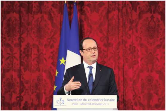 【环球时报欧洲版驻法国特约记者 鲁佳】法国总统奥朗德2月8日在总统府爱丽舍宫举办新春招待会。中国驻法国大使翟隽及部分使馆外交官、多个亚洲国家驻法使节、巴黎市议员陈文雄以及活跃于各行业的旅法亚裔人士代表出席招待会。