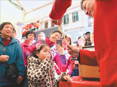 非遗传承人蒋民华在老北京庙会展区展示北京非遗项目“吹糖人”。李细华摄(人民视觉)
