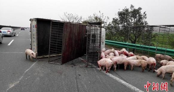 2017年02月17日,湖北省襄阳市,湖北汉十高速十堰往武汉方向k1202处附近,一辆车牌为鄂C满载小猪的货车,因驾驶员操作方向盘失控,车辆侧翻,无人员伤亡,但车上近百头小猪纷纷涌上高速路。