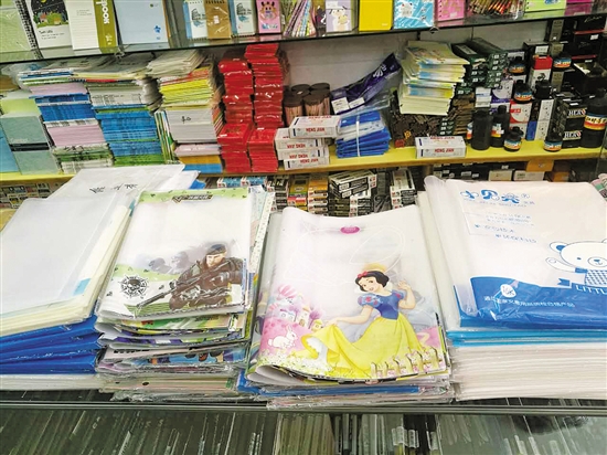 在广州的一些文具店里,印有卡通图案的塑料书皮更受欢迎