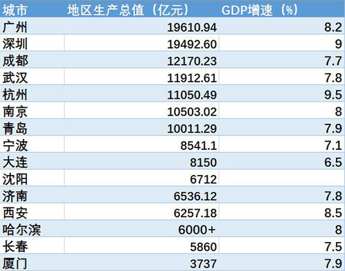 2016年15个副省级城市GDP排名(数据来源:各市统计局及政府工作报告。其中,沈阳市未公布2016年GDP增速;哈尔滨市2016年的GDP数据只表述为“6000亿元以上”),从经济总量上看,广、深两市以接近两万亿遥遥领先。比起去年,成都超越武汉上升一位,南京、青岛迈入万亿大关。除厦门外全都高于5000亿元。增幅方面,杭州位列第一。