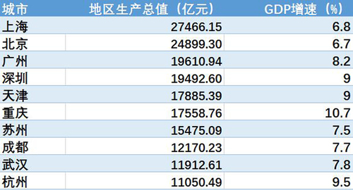 从全国城市GDP前十名榜单来看,包括5个副省级城市,4个直辖市以及普通地级市中经济总量最大的苏州。