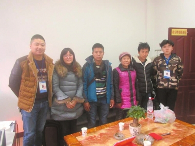 杨会琴(右三)与儿子、女婿在洪雅救助站团聚。