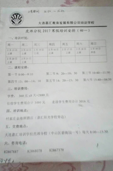 更让冯刚困惑的是,补课的地点并非是在学校,而是在大连一座刚刚装修完的酒店——付家庄金海岸酒店。冯刚说,上课的内容都是由孩子本来所在班级的任课老师教授,但是学校是以一所培训机构的名义进行收费。
