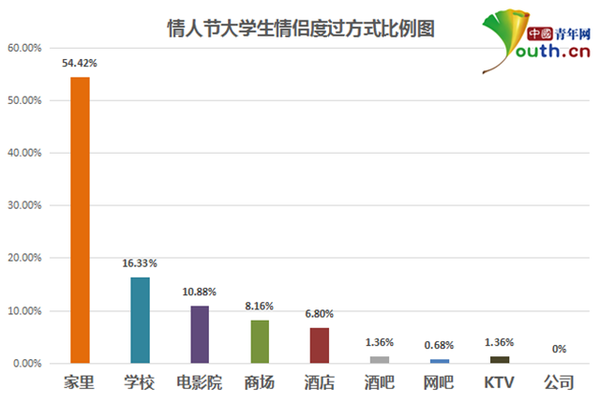 近日,中国青年网对全国147对大学生情侣进行了调查。结果显示:因为情人节正处于寒假期间,65.31%的情侣在情人节当天是异地度过;超四成大学生情侣消费不足100元;一半以上的情人节经费系父母提供的生活费;近七成大学生情侣希望收到礼物,巧克力、鲜花成为热门礼物;“量力而行,不给对方增加负担”是大学生在情人节时的主要消费理念。