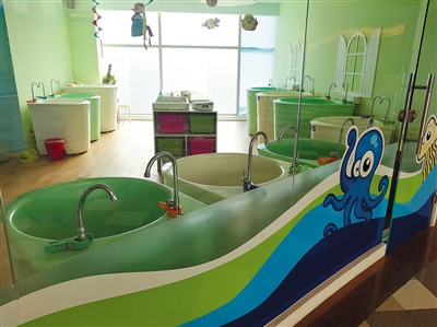 进入游泳区后,店员会给宝宝脱衣服、洗脚,然后再套上游泳圈,洗脚的池子也是宝宝泳后洗澡池,店里并没有在一个宝宝用完后彻底清洁消毒,而是用水简单冲洗后接着给下一个宝宝用。