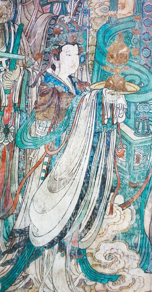 气势浩大的构图与每一个人物栩栩如生的表情、富于变化的衣饰相得益彰。尤其是那一笔笔浓淡不同却相当准确表现出衣纹转折和人物肢体语言的、游丝一般的线条,迎风而动,飘逸自如,体现着“吴带当风”的神韵,令天下人叹为观止……
