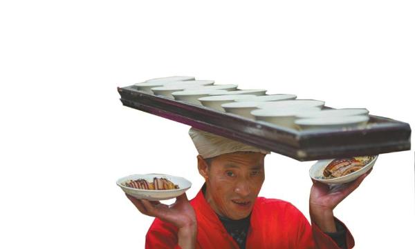38年来,他脚穿草鞋、头裹白布、手持一块方巾,头顶数米长的木制食槽送菜超30万碗,却从未失手一次。