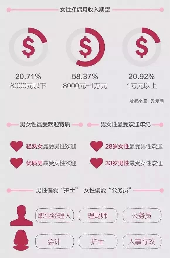日前,某婚恋网站给出调查报告显示,月入8000-10000元的男士最受欢迎,占比达58.37%,而更低或更高的都在20%左右。男性择偶喜欢会计、护士、人事行政类女性,尤其是28岁的轻熟女。女性则偏爱职业经理人、理财师、公务员等男性,特别是33岁的优质男。