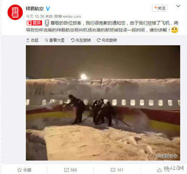 21日下午3点半,祥鹏航空发微博称,“由于我们挖错了飞机,将导致您所选乘的祥鹏航空郑州机场出港的航班被延误一段时间,请您谅解!”