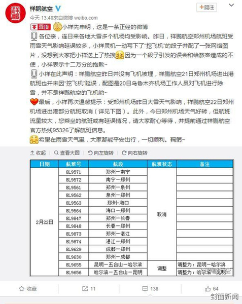 另据了解,受郑州机场昨日大雪天气影响,祥鹏航空22日郑州机场进出港部分航班取消。