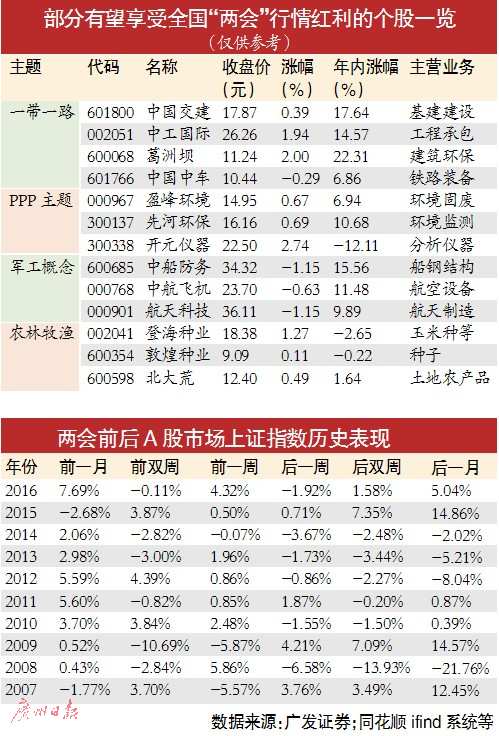 上述券商宏观策略分析师对广州日报全媒体记者表示,从历年情况来看,“两会”前,A股多有正面表现。市场热点多集中在有政策预期的行业和主题中。安信证券分析师表示,历年地方“两会”政府工作报告中的频繁提及的话题,大概率会成为当年全国“两会”重要议题。统计发现,2016年地方“两会”中的热词如“供给侧结构性改革”“国企改革”“脱贫”“环保”等均成为全国“两会”的重要议案。而且两会前A股表现突出的主题投资机会也围绕这些“热词”展开。