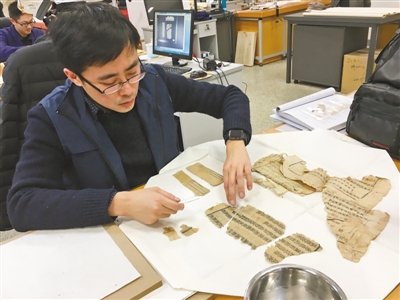 2月17日,在国家图书馆南区一间宽敞明亮的办公室里,国家古籍馆馆员谢谨诚小心翼翼地打开一个白色的纸包,呈现在眼前的是一堆破碎不堪的黄色纸片,上面的文字看似汉字但又明显不是。谢谨诚用小镊子轻轻夹起其中三张碎纸片,上下左右地摆了一会儿,一张书页的模样大致出来了?!按悠扑鸬谋咴悼?,这三张可能是一页,所以先放在一起。但也说不好,毕竟这是西夏文,不像汉字可以通过字迹复原,还要等专家过来鉴定。”谢谨诚说,别看碎成了这样,比这碎的更厉害的他都修过,他是古籍修复师。