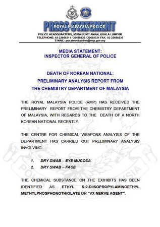 根据马国警方发布文告证实,从金姓男子眼睛及嘴巴采集到的样本中验出化学毒剂VX神经毒剂的成分。