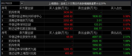 由于连续三个交易日内涨幅偏离值累计达20%,2月23日还未改名的鼎泰新材登上龙虎榜。该榜单显示,买入第一位是机构席位,买入金额为3434.64万元,其次分别为中国中投证券杭州环球中心营业部、浙商证券临安万马路营业部、中信证券深圳总部营业部以及财达证券石家庄新华路营业部。卖出席位中,有两个是机构专用席位,卖出第一位是中信证券北京安外大街营业部,卖出金额为4697.55万元。