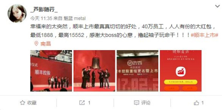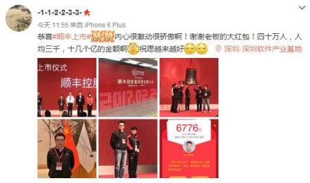 敲钟前,有员工在微博中爆料称,王卫用个人资金为顺丰四十万员工每个人都发了一个红包,最低1888元,最高15552元,粗略计算总金额约10亿元,也就是10个“小目标”。一名顺丰员工在微博上写道,“我们就是别人家的公司” 。