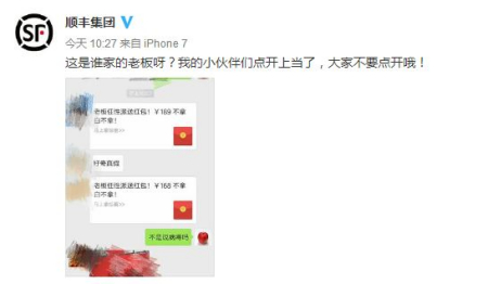 不过,这期间还有一些不和谐的小插曲,有骗子借题发挥,以“老板任性派送红包!”为题借机行骗。顺丰集团官方微博24日发微博提醒网友,“这是谁家的老板呀?我的小伙伴点开上当了,大家不要点开哦!”
