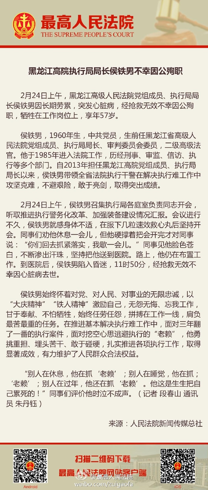 据最高人民法院消息,2月24日上午,黑龙江高级人民法院党组成员、执行局局长侯铁男因长期劳累,突发心脏病,经抢救无效不幸因公殉职,牺牲在工作岗位上,享年57岁。