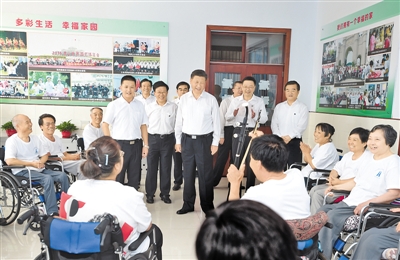 2016年7月28日,中共中央总书记、国家主席、中央军委主席习近平到河北省唐山市调研考察。这是习近平在唐山市截瘫疗养院看望慰问截瘫伤员。 (资料片)新华社发
