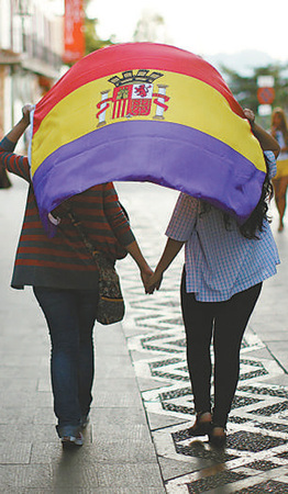2016年6月2日,西班牙安达卢西亚大区隆达市的青年身披国旗参加集会,呼吁各界关注腐败问题。人民视觉