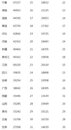 在榜尾,有8个省份的人均GDP低于4万元大关,除了安徽、山西之外,其余全部位于西部地区。