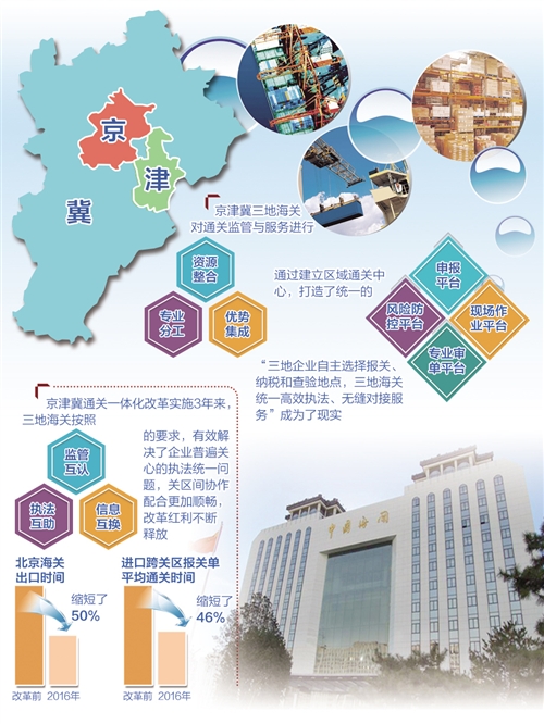 按照这一要求,在海关总署指导下,京津冀三地海关对通关监管与服务进行了资源整合、专业分工和优势集成,通过建立区域通关中心,打造了统一的申报平台、风险防控平台、专业审单平台和现场作业平台,“三地企业自主选择报关、纳税和查验地点,三地海关统一高效执法、无缝对接服务”成为现实。