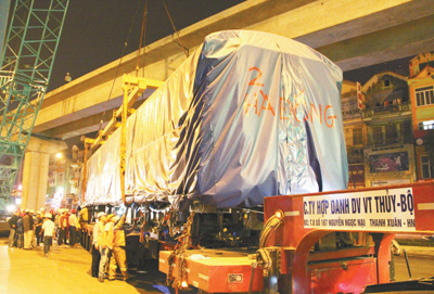吉灵—河东线城铁共采购13列电动客车,每列车分别有4辆车厢。按照施工进度要求,首列车的4辆车厢于1月20日从北京地铁车辆装备有限公司出厂,2月12日运抵越南北部的海防港,19日凌晨到达河内。21日凌晨,在上百名越南围观群众的欢呼和掌声中,中国专为越南首条城铁定制的第一辆列车车厢被成功吊装上桥。尽管下着细雨,几十名记者用长枪短炮对准即将起吊的车厢拍摄,空中还飞着几架拍摄用无人机。