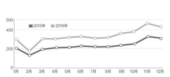 但是,稳居“世界第一快递大国”的中国快递业营收规模和业务量还在持续攀升。据国家邮政局数据,2016年中国快递行业业务量累计完成312.8亿件,同比增长51.3%,业务收入近4000亿元,同比增长43.5%。