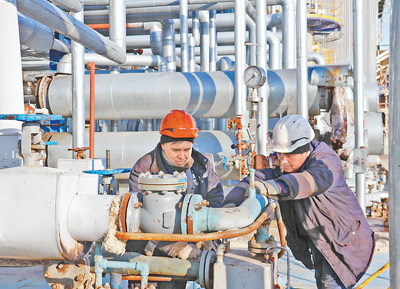 中哈里海沥青合资公司哈萨克斯坦员工在认真检修工厂设备。人民日报记者周翰博摄