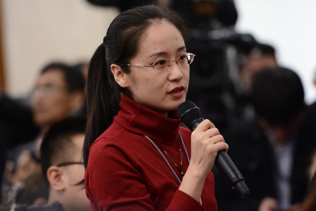 十二届全国人大五次会议于3月4日上午11时在人民大会堂新闻发布厅举行新闻发布会,由大会发言人傅莹就大会议程和人大工作相关的问题回答中外记者的提问。图为光明日报融媒体记者提问。人民网记者 张启川 摄