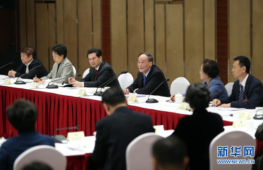 3月4日,中共中央政治局常委、中央纪委书记王岐山看望出席全国政协十二届五次会议的共青团、总工会、妇联、青联界委员并参加讨论。新华社记者 谢环驰 摄
