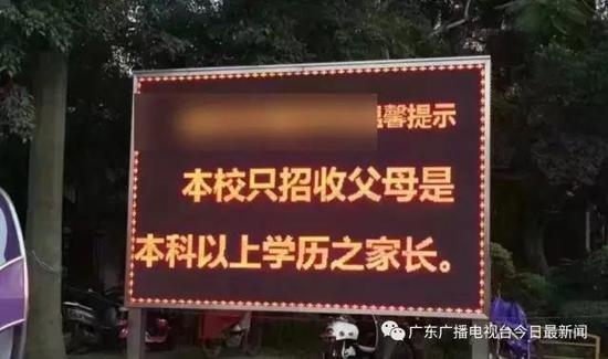 今日,有广州老友的朋友圈里面,晒出了一张图片,里面是广州某私立学校的一个电子屏,上边显示,“本校只招收父母是本科以上学历之家长”。虽然电子屏上的信息似乎有语病,但正好带出了大家的疑问,究竟这间学校,是招学生,还是招家长呢?如果是正常招生,为什么要将家长学历列为招生条件呢?为了求证这件事的真假,老友记今日去到事发的这间私立学校,但发现个电子屏今日就没有开。不过有一位家长就讲:自己的小孩在这读书,昨天的确见过那条信息。