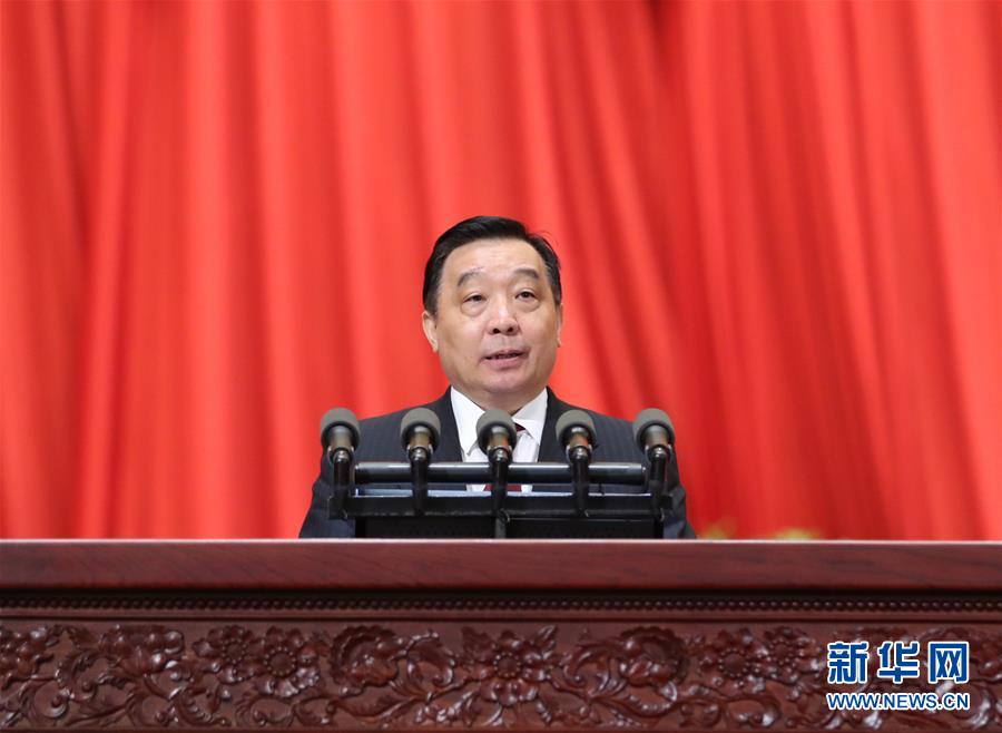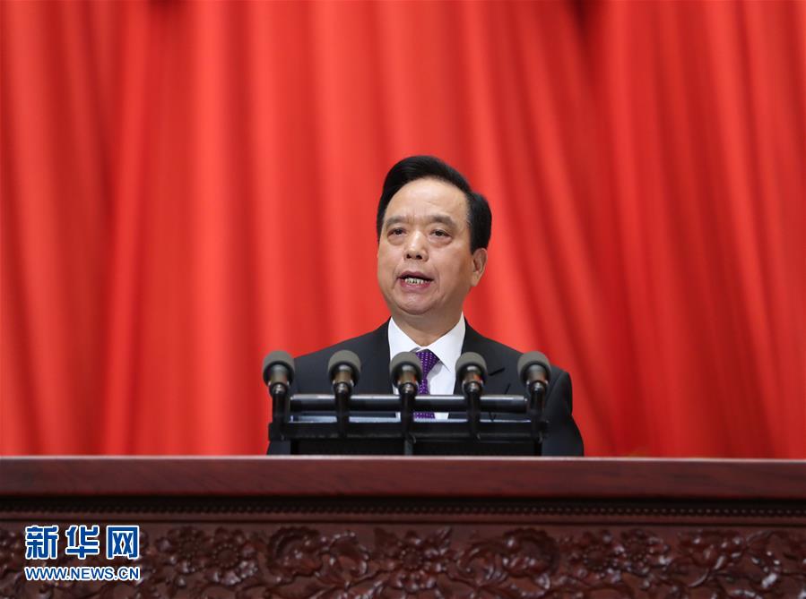 全国人大常委会副委员长兼秘书长王晨作第十三届全国人民代表大会代表名额和选举问题的决定草案的说明、中华人民共和国香港特别行政区选举第十三届全国人民代表大会代表的办法草案和中华人民共和国澳门特别行政区选举第十三届全国人民代表大会代表的办法草案的说明。新华社记者 谢环驰 摄