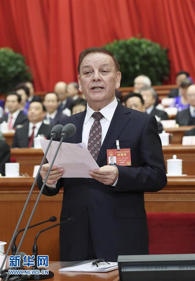3月8日,十二届全国人大五次会议在北京人民大会堂举行第二次全体会议。艾力更·依明巴海主持会议。 新华社记者 马占成 摄