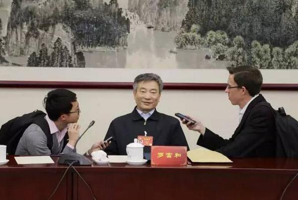 3月5日下午,民进界委员分组讨论政府工作报告间隙,罗富和委员接受媒体采访。