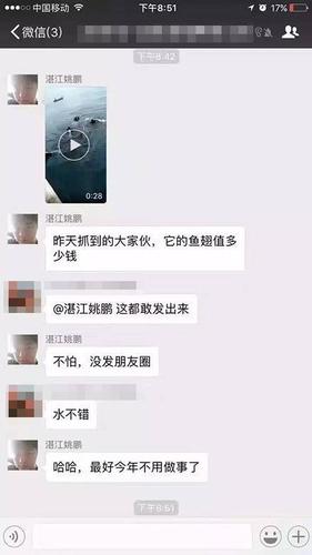 至于为何要转发视频在微信群,姚鹏说:“群里有人经常晒自己抓的石斑鱼,然后我就发到群里,说(自己)今天捕到了一个大家伙?!?/p>