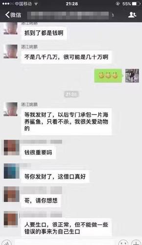 网上流传的疑似广东湛江潜水员捕捞鲸鲨的微信聊天截图。