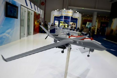 2017年2月23日在阿联酋阿布扎比国际防务展“中国防务”展区拍摄的翼龙Ⅱ无人机模型。 新华社记者赵丁喆摄