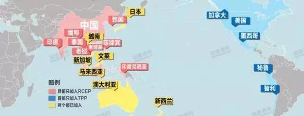 我们再来看看TPP和RCEP成员国示意图↓↓↓