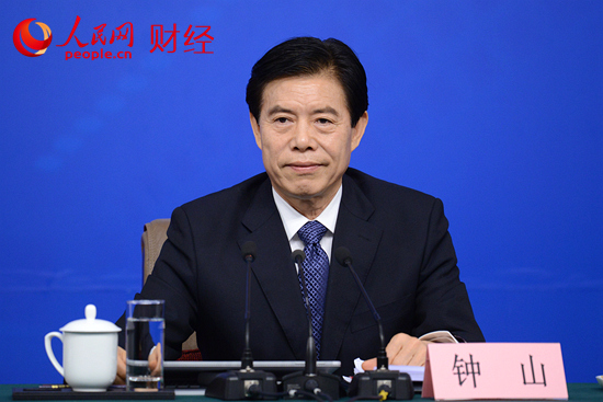 人民网北京3月11日电 (人民网前方报道组 记者夏晓伦) 3月11日下午,十二届全国人大五次会议新闻中心在梅地亚中心多功能厅举行记者会,主题是“改革开放调结构 创新驱动促发展”,商务部部长钟山、副部长王受文、副部长钱克明出席并回答中外记者的提问。