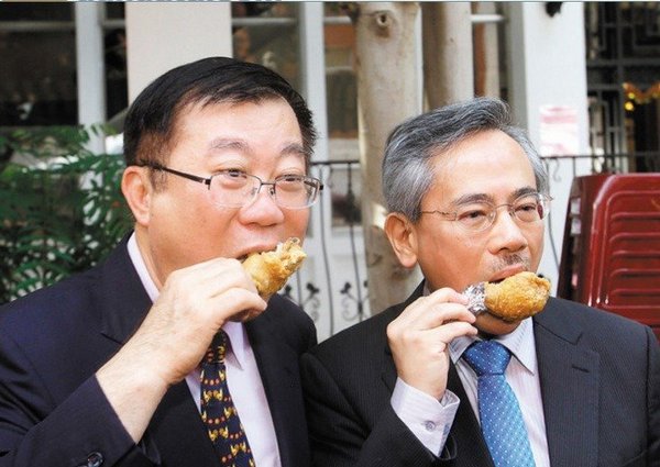 陈保基(左)和邱文达(右)担任台“农委会主委”、“卫生署署长”时,也曾公开大啃鸡肉,来证明安全。(台湾《联合》报系资料图)