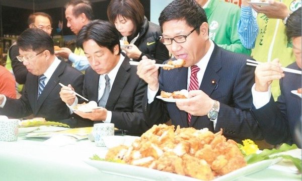 台南市长赖清德(左2)公开场合吃鸡肉证明安全。(台湾《联合》报系资料图)