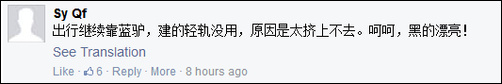 “出行继续靠蓝驴,建的轻轨没用,原因是太挤上不去。呵呵,黑得漂亮!”