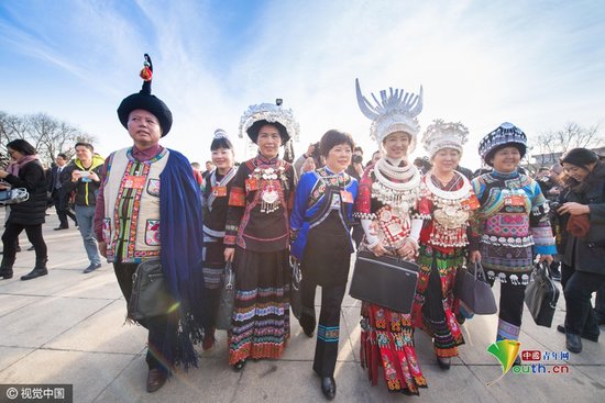 贵州代表团少数民族同胞步入人民大会堂,绚丽的服饰形成了一道亮丽的风景线