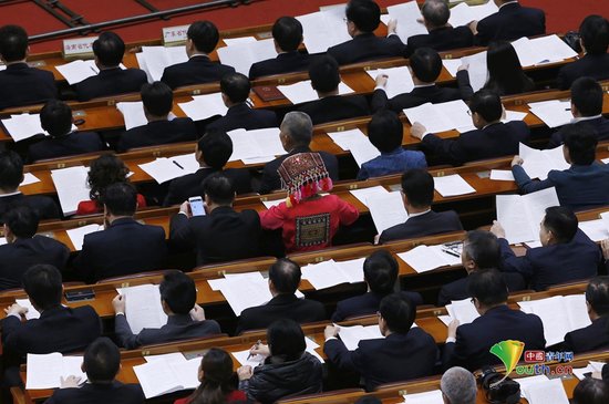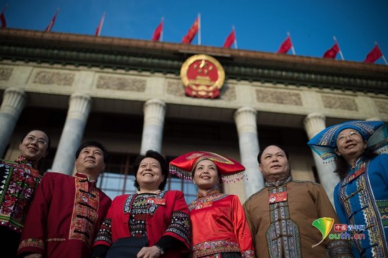 2017年3月5日,北京,广西代表团少数民族代表穿着传统服饰