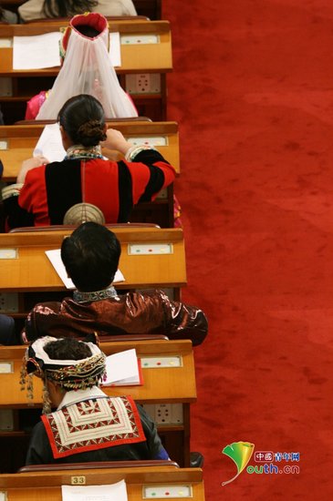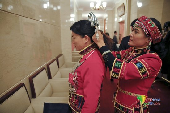 北京,十二届全国人大四次会议举行,少数民族代表调整头饰